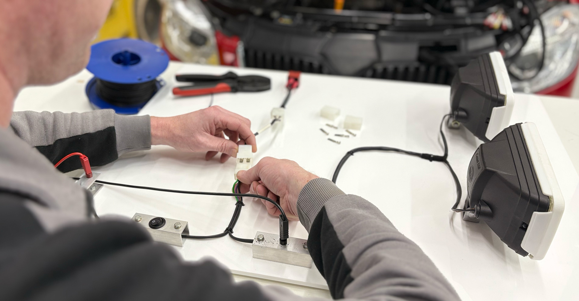 De training begint met eenvoudige metingen aan diverse elektrische schakelingen. Daarbij gaat het er vooral om dat je de multimeter goed instelt en aansluit. Als je de basisprincipes beheerst en ook weet hoe je elektrische schema’s moet lezen, wordt het menens. Je gaat metingen uitvoeren aan echte voertuigen, net zoals in een werkplaats. Je leert niet alleen meten, maar ook hoe je accessoires aansluit. Ook leer je hoe je een stekker repareert.