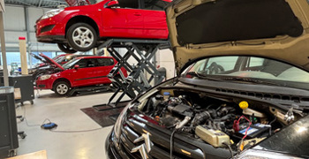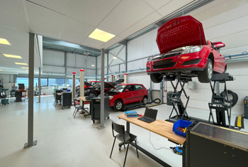 Werkplaats met moderne voertuigen en actuele leermiddelen.